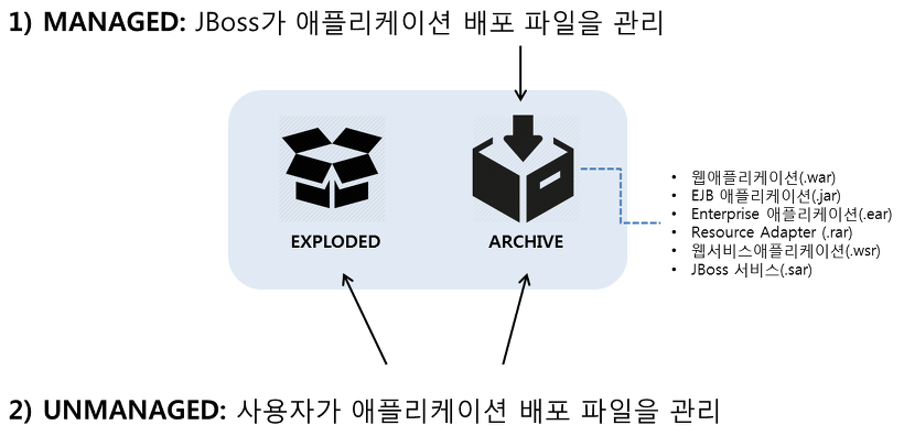 JBoss의 애플리케이션 배포 방식은 크게 Managed 방식과 Unmanaged 방식이 있고 또, Archive 방식과 Exploded 방식이 있다. JSP 파일 등 특정 파일만 변경하여 배포하고자 할 경우에는 Exploded 방식을 사용한다.