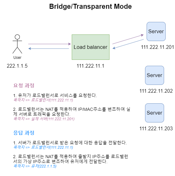 사용자가 서비스를 요청하면 L4로 전달된 목적지 IP 주소를 real server IP 주소로 변조하고 MAC 주소를