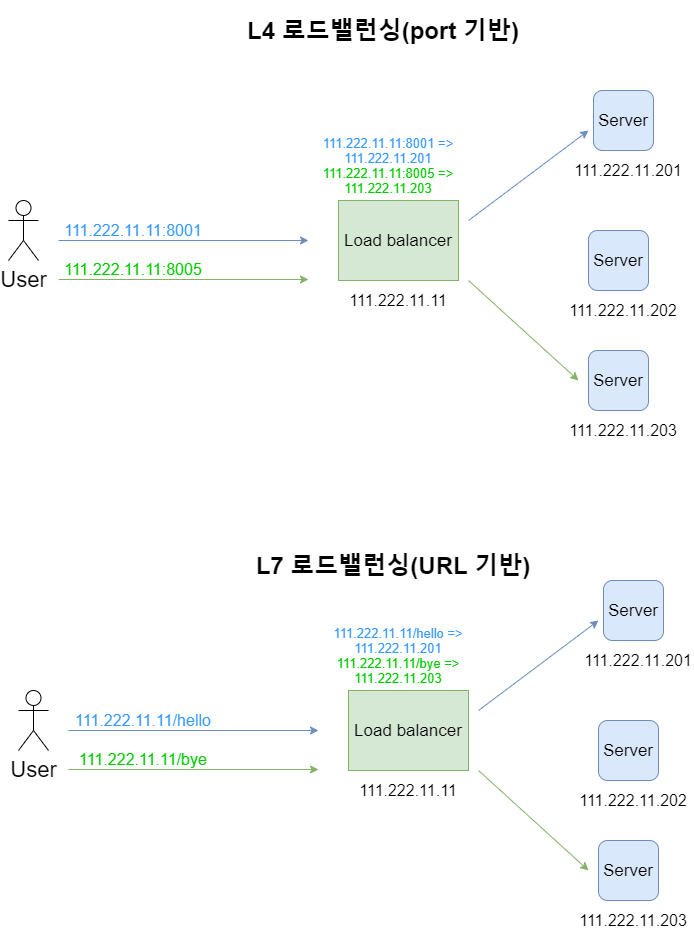 | L7 | Application 계층을 사용, 요청(URL) 기반 부하 분산 |