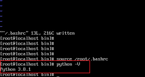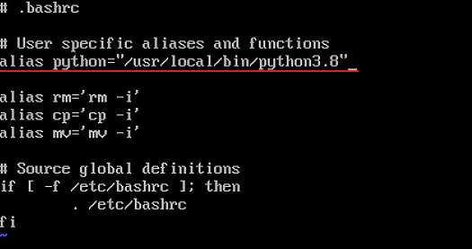 ▼ 새로 설치한 Python 3.8.1 을 python 기본 버전으로 설정하기 위해 vi 편집기로 .bashrc 파일을 오픈합니다. 그리고 I 를 눌러 편집 모드로 변경합니다.